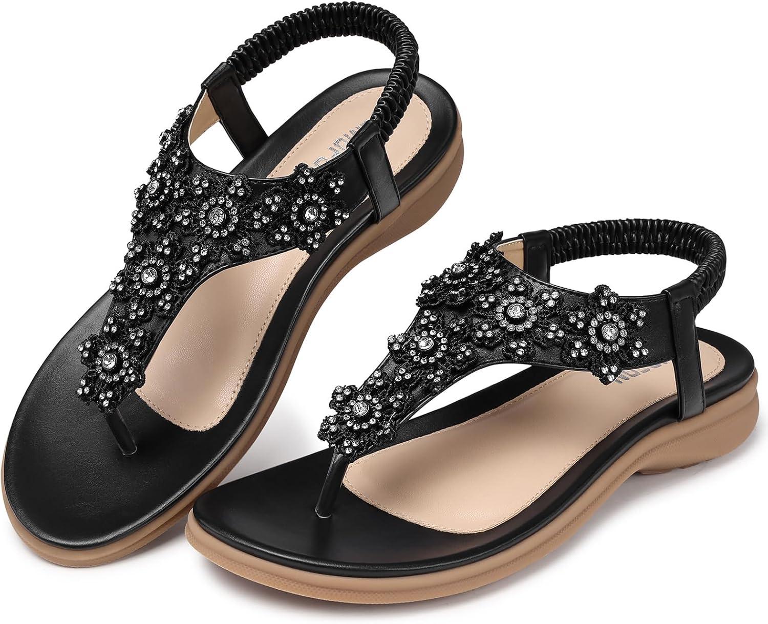 TEMOFON Sandals for Women Flat Dressy Summer Flower Sandals with Ankle Strap Comfortable Casual Walking Flat Sandals Size 5-11(28-black)
