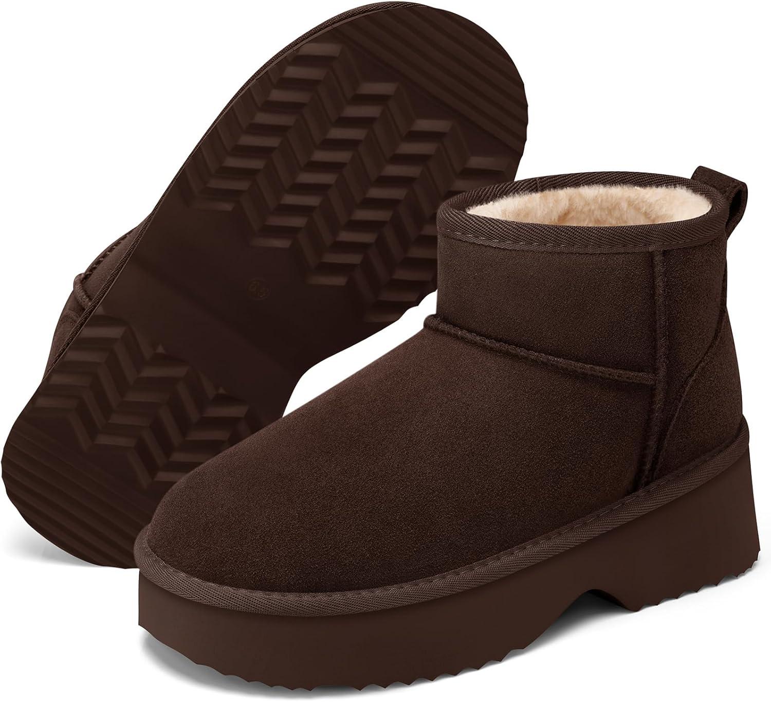 Genuine Leather Upper These mini winter boots for women feature a 100% premium genuine suede leather upper offering a water resistant dust-proof and easy to clean making your life more convenient Lined with 17mm soft fax fur these fuzzy snow boots women provide superior warmth and comfort for all-day wear during the coldest monthsSlip-Resistant Durable Sole The lightweight EVA outsole of comfortable winter women's boots 2025 not only offers outstanding durability but also excellent grip Non slip ankle boots for women can ensure your stability and traction for every step The womens ankle boots with cushioned memory foam insoles offer outstanding comfort and foot support allowing you to enjoy daily support Versatile Style Classic Style with Suede and faux fur womens boots will go great with any winter outfit such as trench coats jackets overcoats jeans and leggingsThese comfortable snow boots make every step feel like walking on clouds These short boots women are great fit easy to slip on and off warm comfy for this cold weather Multi Occasion From outdoor outing to indoor casual these cute brown suede boots for women are your go-to footwear choice for vacation walking work home shopping and more Water resistant snow booties with cozy faux fur lining outer material is durable yet soft and the soles provide great traction which is a lifesaver when walking on snowroad Personalize Your Style A customizable ribbon accessory enables you to create an appearance that suits your unique personality ensuring that your black faux fur boots stand out A variety of colors of slip resistant ladies winter boots are available for you to choose from adding a touch of color to your winter tan taupe chestnut walk ski travel home house casual outdoor indoor woman ladies winter snow insulated mini warm platform booties suede faux fur lined fuzzy memory foam insole water resistant comfy anti slip on lightweight classic cute stylish size 6-11