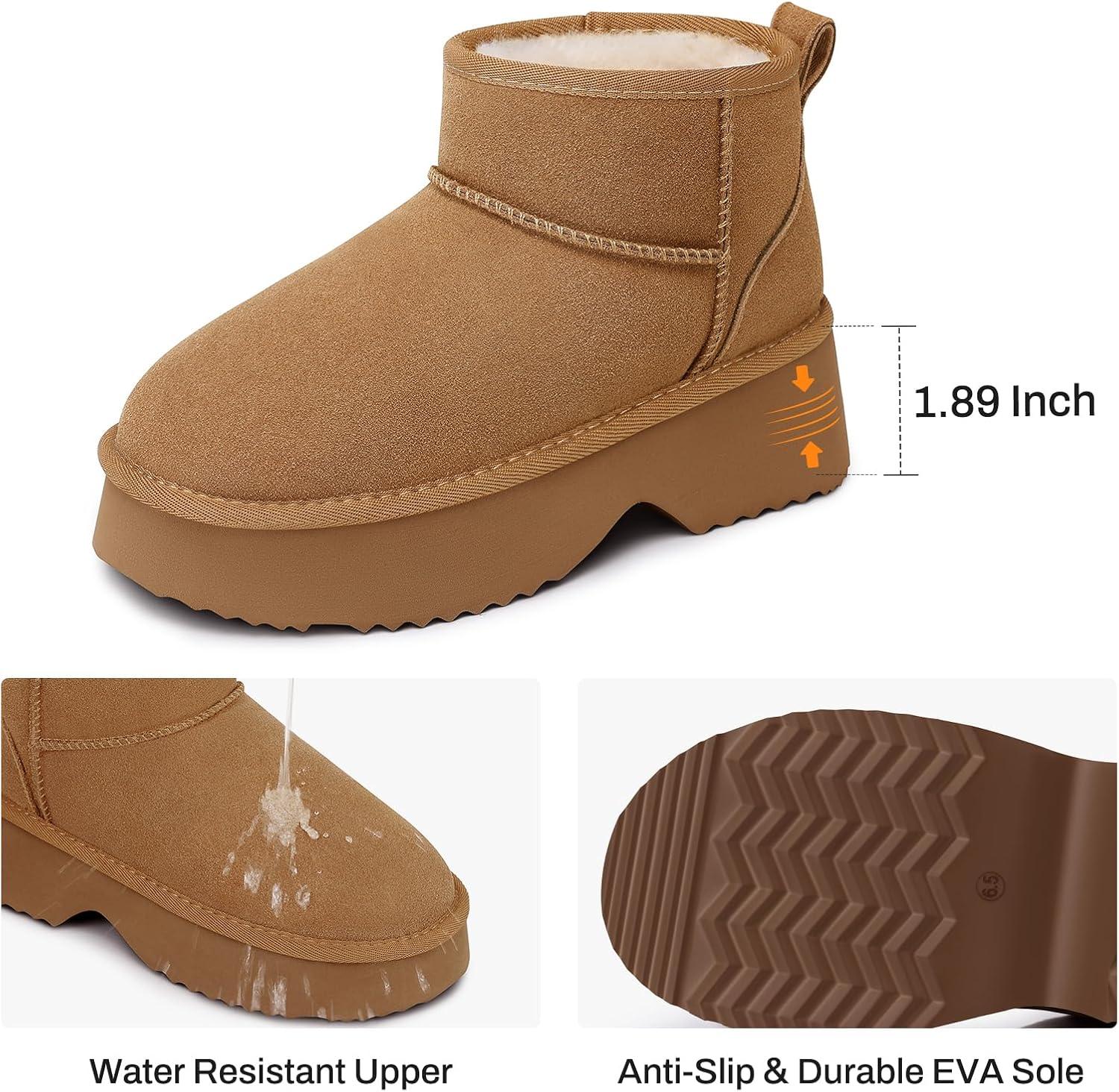 Genuine Leather Upper These mini winter boots for women feature a 100% premium genuine suede leather upper offering a water resistant dust-proof and easy to clean making your life more convenient Lined with 17mm soft fax fur these fuzzy snow boots women provide superior warmth and comfort for all-day wear during the coldest monthsSlip-Resistant Durable Sole The lightweight EVA outsole of comfortable winter women's boots 2025 not only offers outstanding durability but also excellent grip Non slip ankle boots for women can ensure your stability and traction for every step The womens ankle boots with cushioned memory foam insoles offer outstanding comfort and foot support allowing you to enjoy daily support Versatile Style Classic Style with Suede and faux fur womens boots will go great with any winter outfit such as trench coats jackets overcoats jeans and leggingsThese comfortable snow boots make every step feel like walking on clouds These short boots women are great fit easy to slip on and off warm comfy for this cold weather Multi Occasion From outdoor outing to indoor casual these cute brown suede boots for women are your go-to footwear choice for vacation walking work home shopping and more Water resistant snow booties with cozy faux fur lining outer material is durable yet soft and the soles provide great traction which is a lifesaver when walking on snowroad Personalize Your Style A customizable ribbon accessory enables you to create an appearance that suits your unique personality ensuring that your black faux fur boots stand out A variety of colors of slip resistant ladies winter boots are available for you to choose from adding a touch of color to your winter tan taupe chestnut walk ski travel home house casual outdoor indoor woman ladies winter snow insulated mini warm platform booties suede faux fur lined fuzzy memory foam insole water resistant comfy anti slip on lightweight classic cute stylish size 6-11