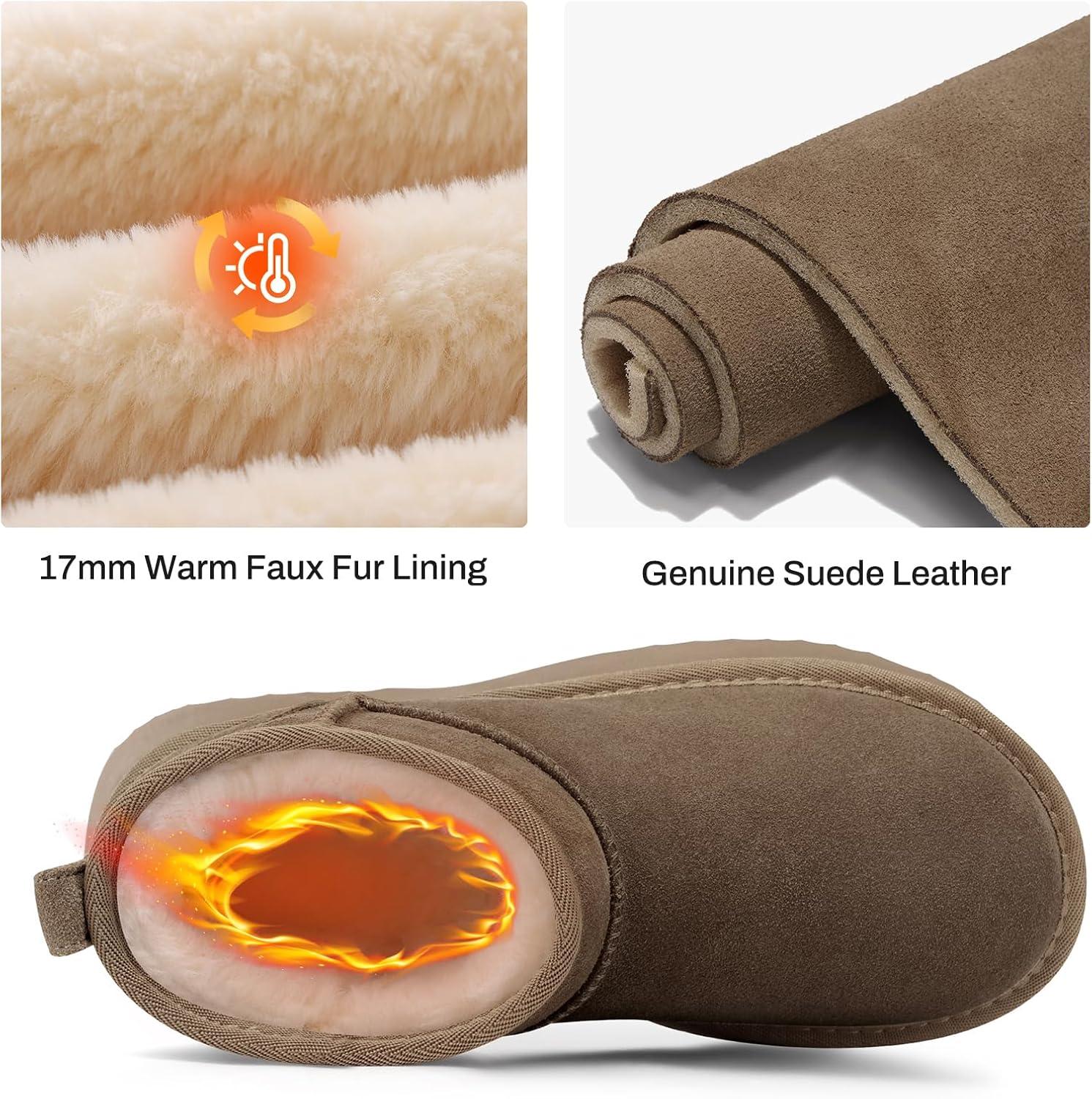 Genuine Leather Upper These mini winter boots for women feature a 100% premium genuine suede leather upper offering a water resistant dust-proof and easy to clean making your life more convenient Lined with 17mm soft fax fur these fuzzy snow boots women provide superior warmth and comfort for all-day wear during the coldest monthsSlip-Resistant Durable Sole The lightweight EVA outsole of comfortable winter women's boots 2025 not only offers outstanding durability but also excellent grip Non slip ankle boots for women can ensure your stability and traction for every step The womens ankle boots with cushioned memory foam insoles offer outstanding comfort and foot support allowing you to enjoy daily support Versatile Style Classic Style with Suede and faux fur womens boots will go great with any winter outfit such as trench coats jackets overcoats jeans and leggingsThese comfortable snow boots make every step feel like walking on clouds These short boots women are great fit easy to slip on and off warm comfy for this cold weather Multi Occasion From outdoor outing to indoor casual these cute brown suede boots for women are your go-to footwear choice for vacation walking work home shopping and more Water resistant snow booties with cozy faux fur lining outer material is durable yet soft and the soles provide great traction which is a lifesaver when walking on snowroad Personalize Your Style A customizable ribbon accessory enables you to create an appearance that suits your unique personality ensuring that your black faux fur boots stand out A variety of colors of slip resistant ladies winter boots are available for you to choose from adding a touch of color to your winter tan taupe chestnut walk ski travel home house casual outdoor indoor woman ladies winter snow insulated mini warm platform booties suede faux fur lined fuzzy memory foam insole water resistant comfy anti slip on lightweight classic cute stylish size 6-11