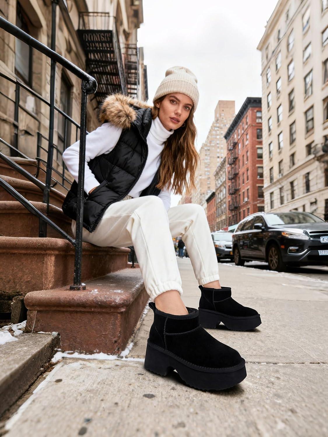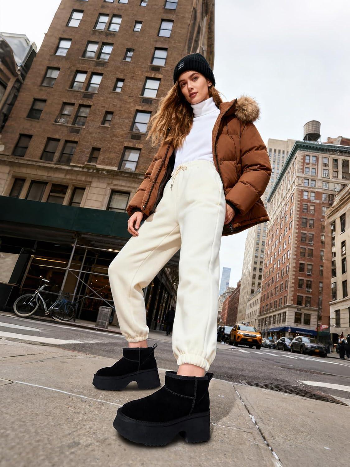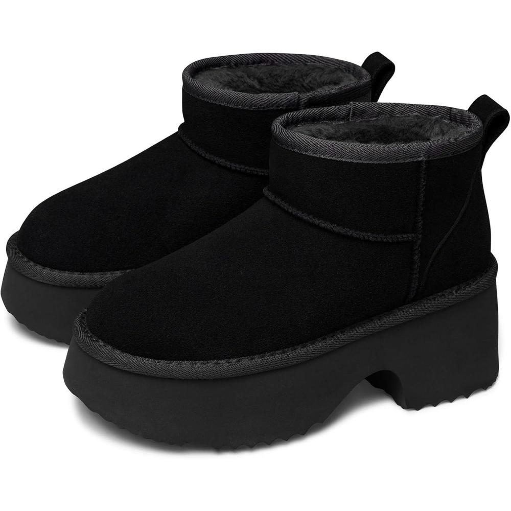 TEMOFON Womens Snow Mini Boots: Genuine Suede Leather Heights Platform Ankle Boots – Winter Warm Fur Lined Anti-Slip Fashion Booties(64-black)